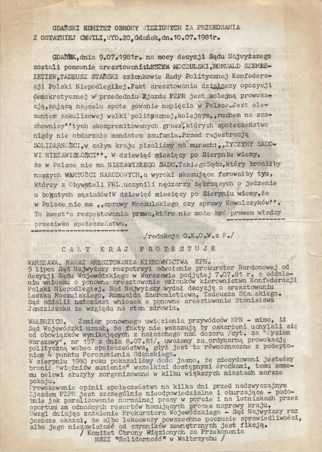 Gdański Komitet Obrony Więzionych za Przekonania : z ostatniej chwili. R. 1981, wyd. 20.10.00 zł