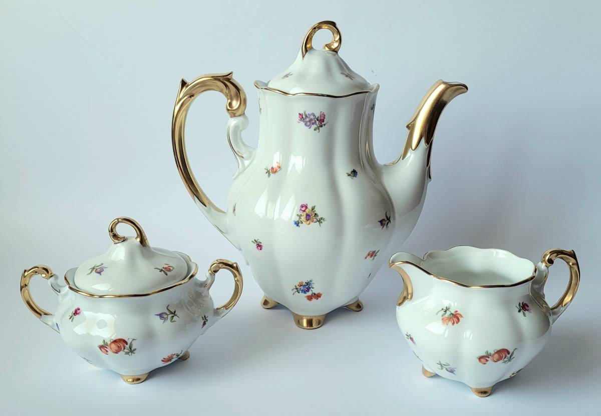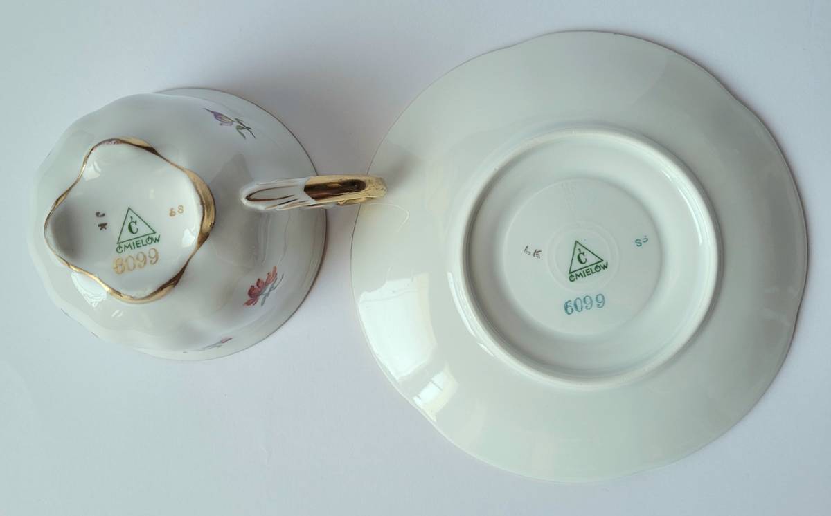 Marcinek, fason 520, dekoracja 6099: kolorowe drobne kwiaty i złocenia.