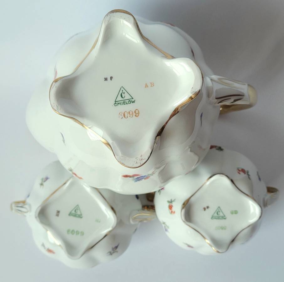 duży dzbanek, cukiernica, mlecznik, 6 filiżanek ze spodkami. Projektant Bogumił