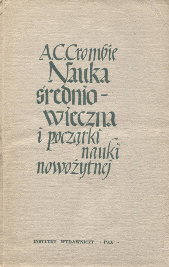 Crombie Alistair Cameron – Nauka średniowieczna i początki nauki nowożytnej. T. 1. Nauka w średniowieczu w okresie V-XIII w. T. 2. Nauka w późnym średniowieczu i na początku czasów nowożytnych w okresie XIII-XVII w. / A. C. Crombie; przełożył Stanisław Łypacewicz. Wyd. 1. Warszawa 1960, Instytut Wydawniczy Pax. 19 cm, s. 319, [1], s. tabl. [32] z ilustracjami, ilustracje w tekście; s. 471, [1], s. tabl. [24] z ilustracjami. Ślady lekkich wgięć tylnej części okładki t. 1 i przedniej t. 2, drobne plamki na licu okładki t. 1.