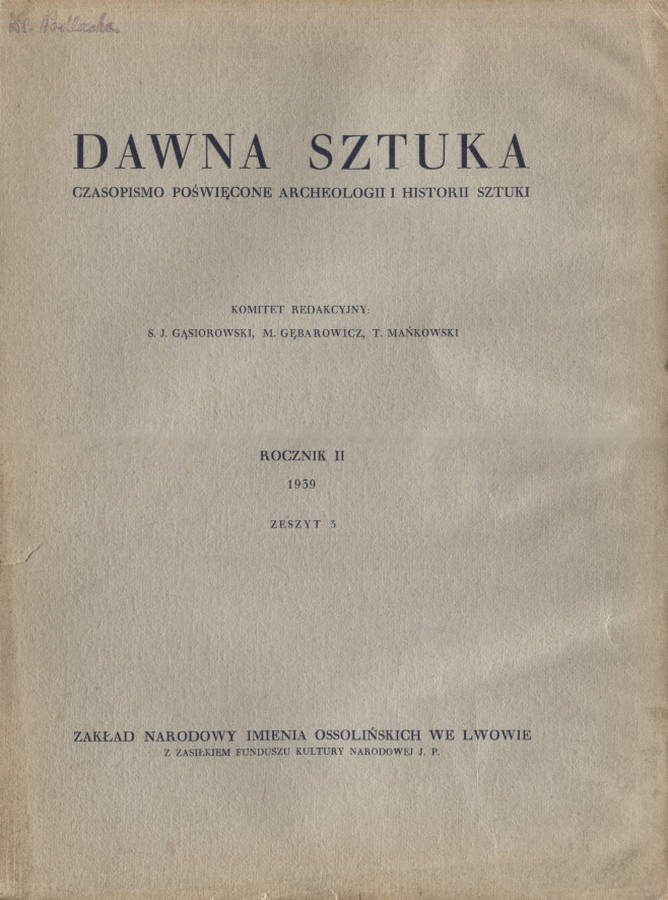 | Dawna Sztuka : czasopismo poświęcone archeologii i historii sztuki. Zakład Narodowy im. Ossolińskich. Lwów. R. 2 : 1939, z. 3. 32 cm. Łącznie ukazało się 7 zeszytów (1938, z. 1-4; 1939, z. 1-3). Zakurzenie okładki, ślad lekkiego zawilgocenia (sfałdowania) marginesu kart. |