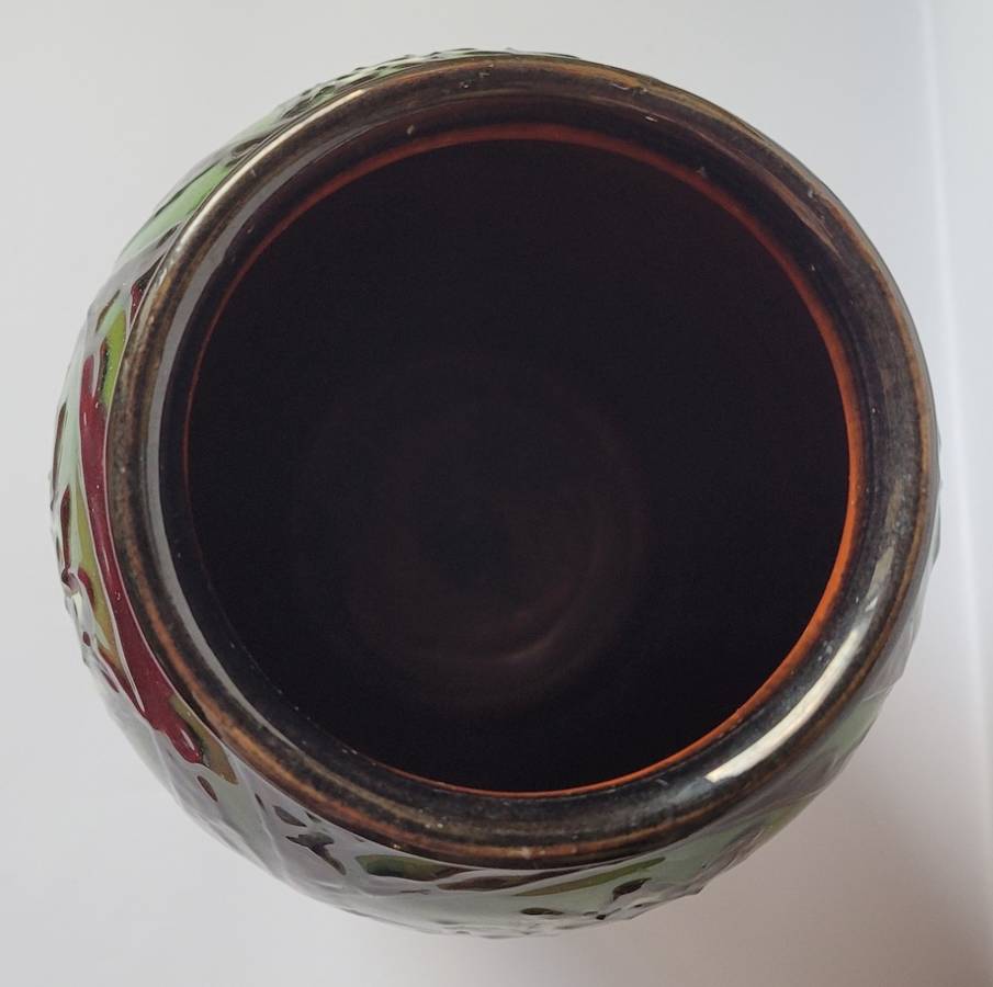 czerwona, emalia, dekoracja ozdobne kwiaty (tulipany), sygn. na spodzie: znak