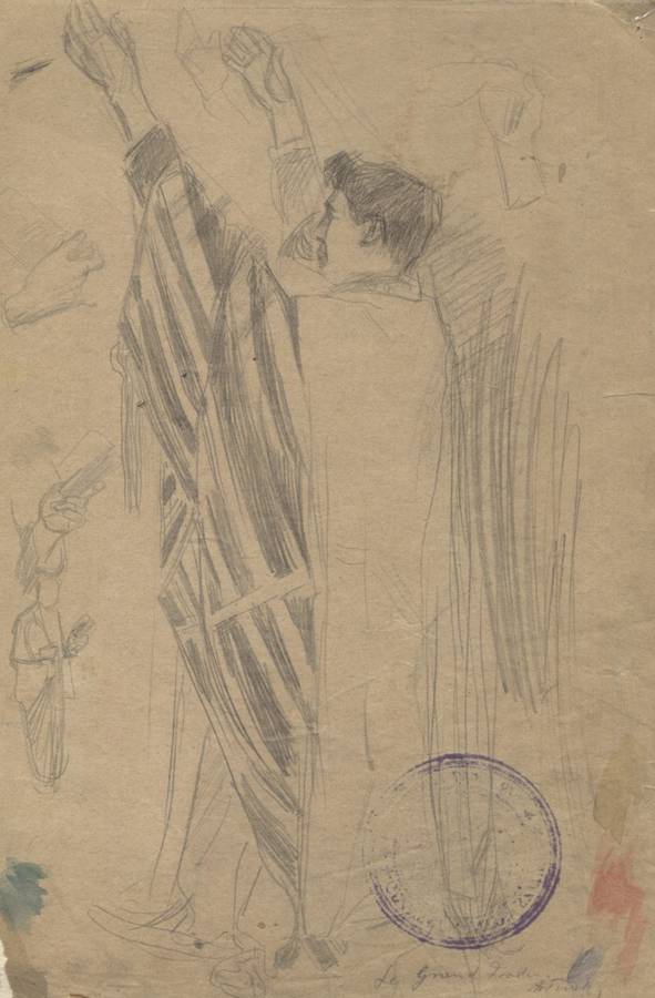 Kredka, karton 23x17 cm, sygn. l. d. (4) Postać z uniesionymi rękami. Ołówek,