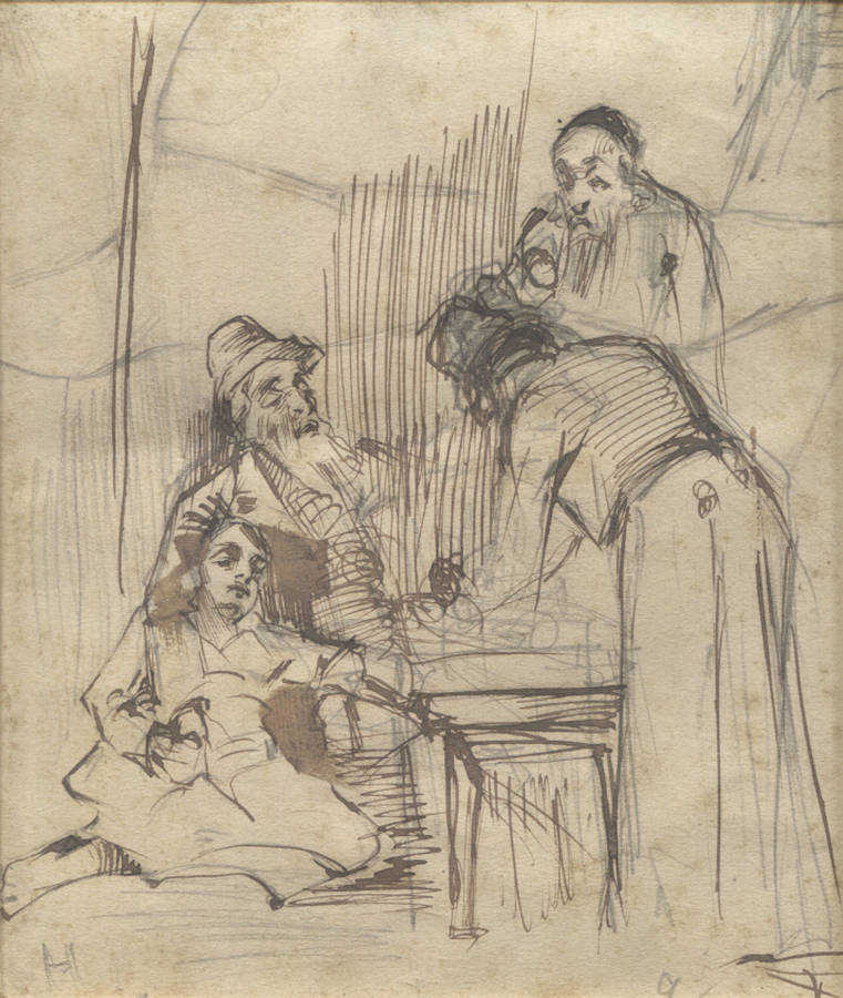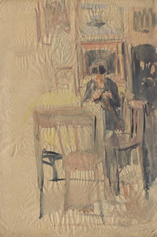 Scena rodzajowa. Piórko, tusz, ołówek, lawowanie; papier 15x13 cm. (8) Szyjąca.