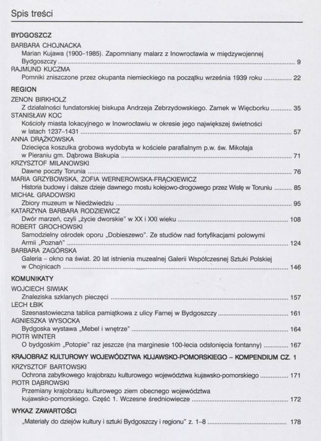 Materiały do dziejów kultury i sztuki Bydgoszczy i regionu / Pracownia Dokumentacji i Popularyzacji Zabytków Wojewódzkiego Ośrodka Kultury w Bydgoszczy. Zeszyt 9. Bydgoszcz 2005, Wojewódzki Ośrodek Kultury. 23 cm, s. 182, [1], ilustracje, mapy, plany, tablica genealogiczna.