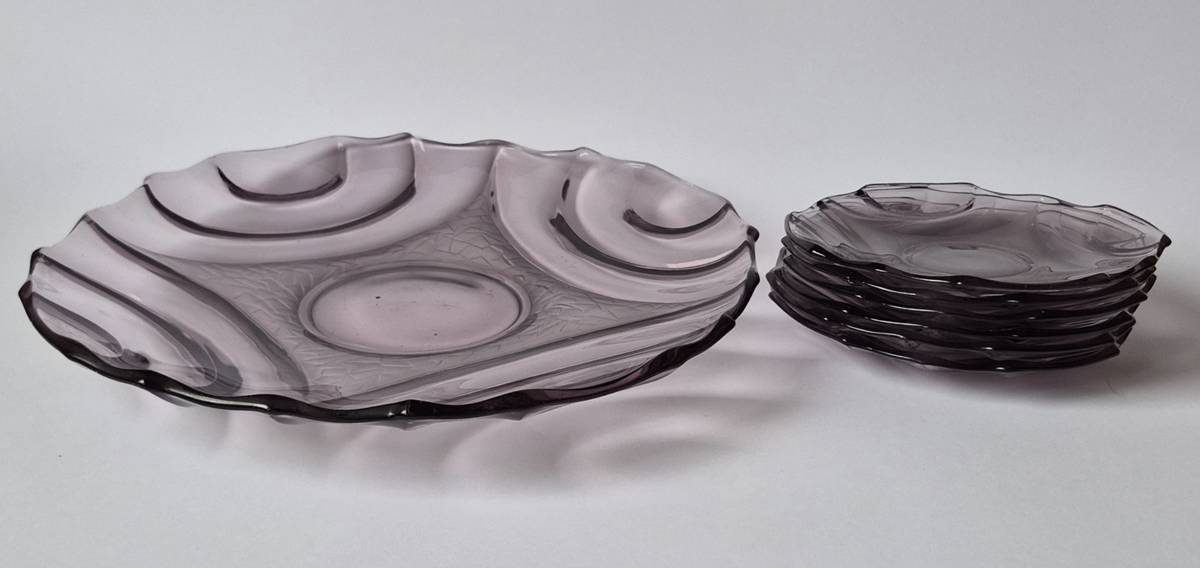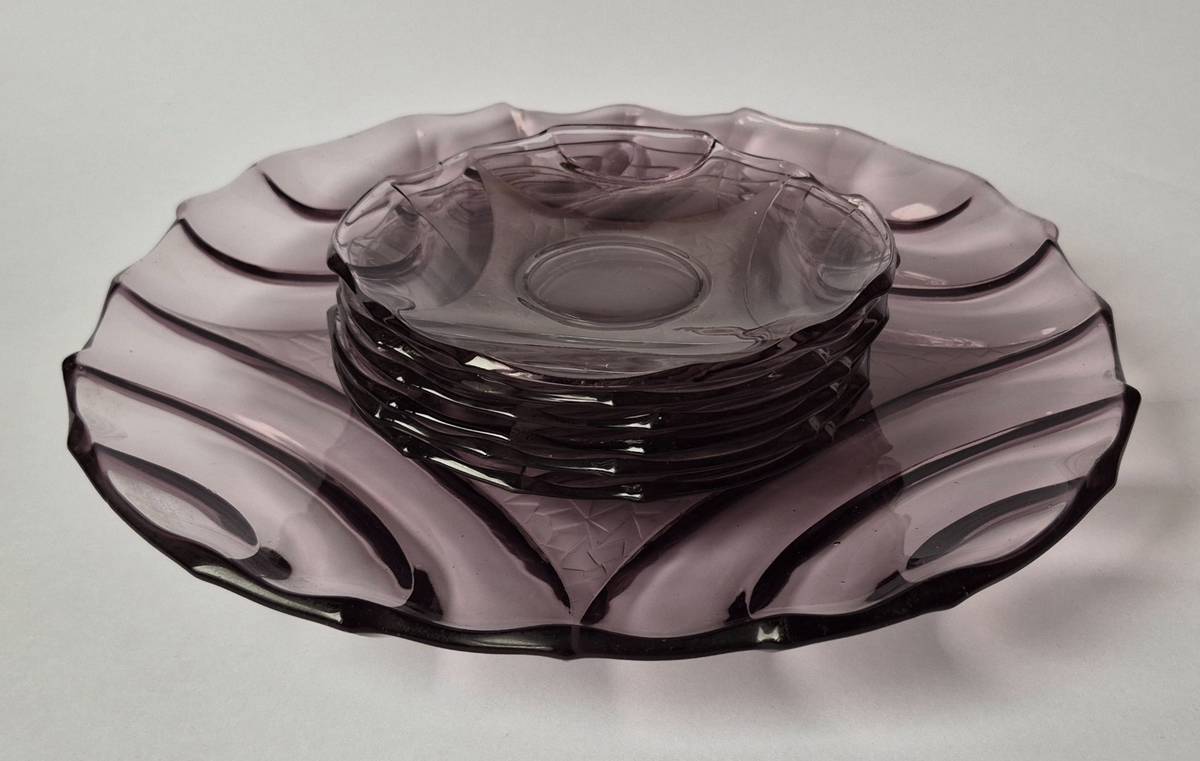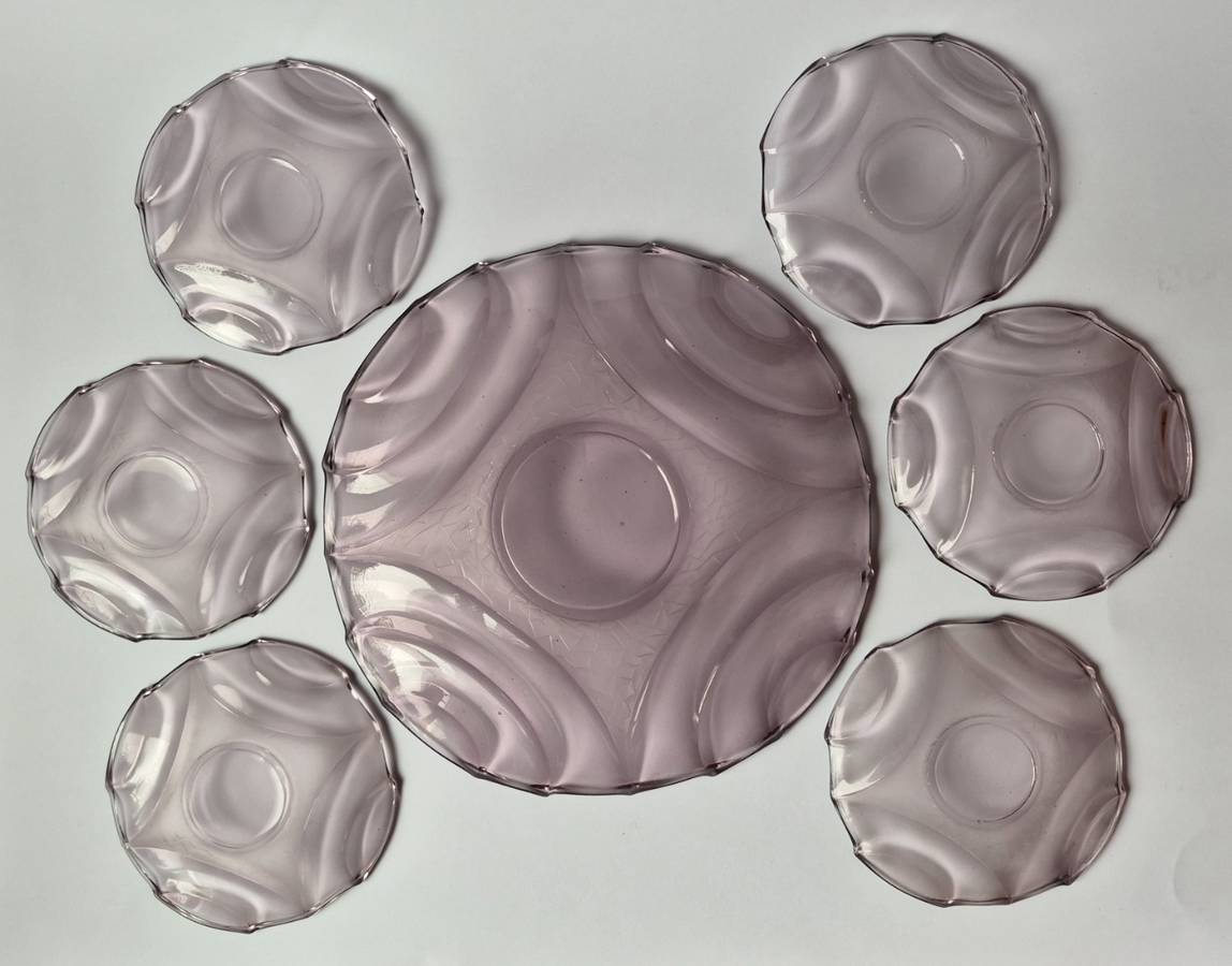 i 6 talerzyków deserowych (komplet). Huta Szkła J. Stolle „Niemen”, Brzozówka,