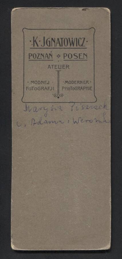 [Poznań] K. Ignatowicz, Poznań - Posen, Atelier modnej fotografji / moderner Photographie. Fotografia kartonikowa typu cdv, 12x5 cm. Verso odręcznie długopisem: Marysia Piszczek, c. Adama i Weroniki. Lekkie otarcia rogów.