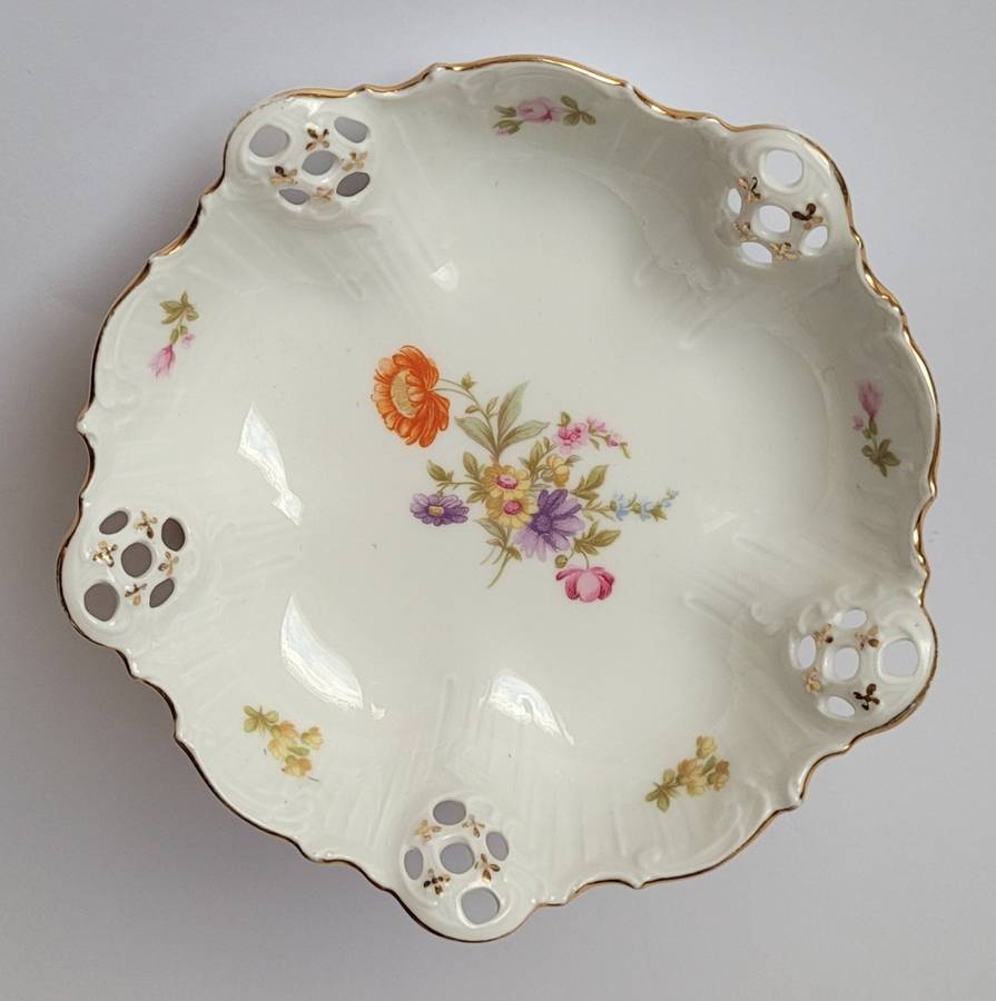 Rosenthal. Paterka porcelanowa na nóżkach, Rosenthal Moliere, Bawaria, lata 1898-1906. Porcelana barwy białej z motywem kwiatowym, brzegi paterki złocone, wymiary: wysokość ok. 6,7 cm, średnica ok. 19,5 cm. Na spodzie paterki sygnatura: znak wytwórni Rosenthal / Moliere / Bavaria / 438 / 39. Stan zachowania bardzo dobry, ślady użytkowania stosownie do wieku obiektu. Literatura: Dieter Strauss - Rosenthal: Service, Figuren, Zier- und Kunstobjekte. Augsburg 1995. Zob.: https://muzeumszkla.pl/antyk/patera-na-nozkach-rosenthal/