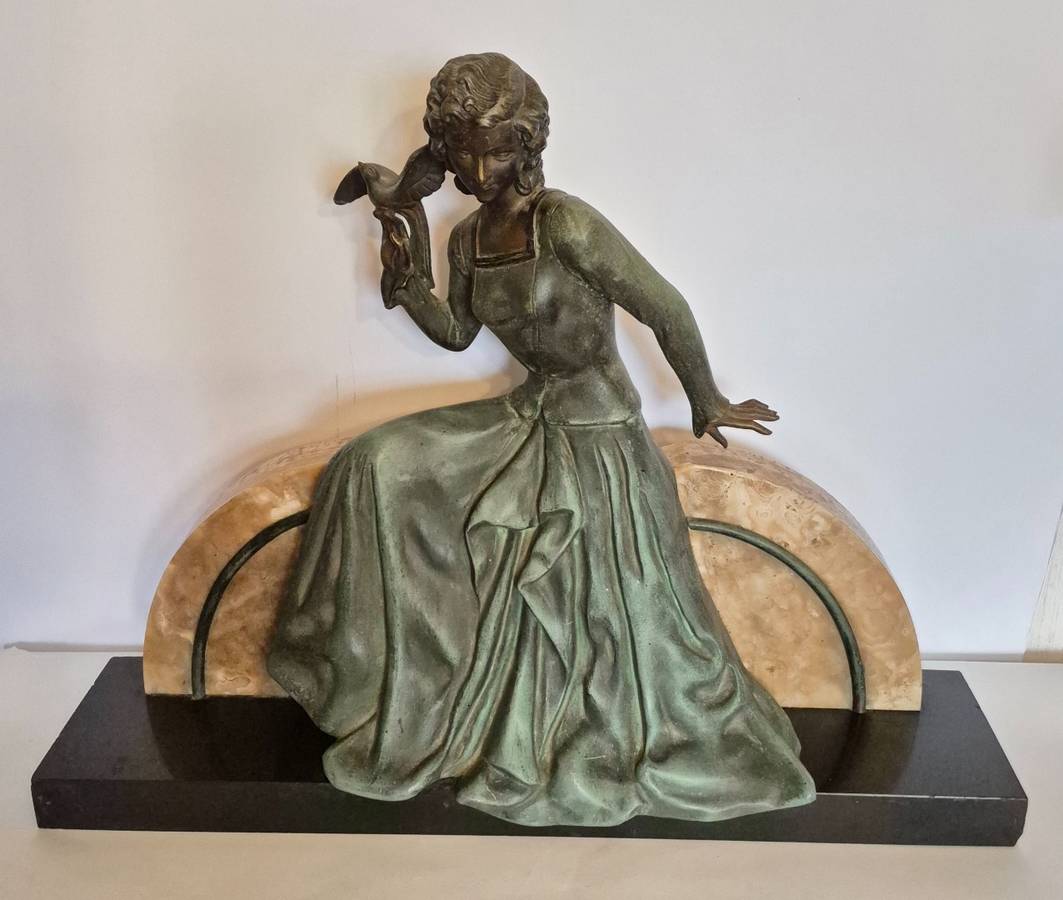 – Kobieta z ptakiem. Francja, lata 30-te. Rzeźba: brąz barwiony, marmur, sygn.