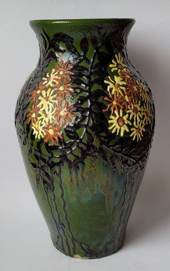 Wazon ceramiczny z secesyjną dekoracją. Märkische Kunst- und Bauerntöpferei Fr. M. Bräuning, Hermsdorf Berlin, lata 20-te XX w.