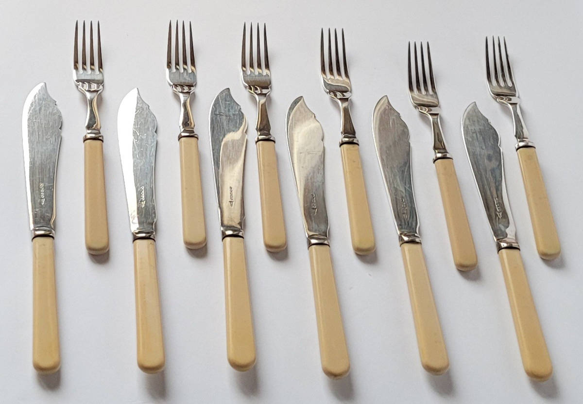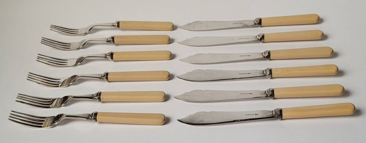 Zestaw sztućców do ryb na 6 osób, plater. Anglia, Wytwórnia William Hutton & Sons w Sheffield, 2 połowa XIX w.